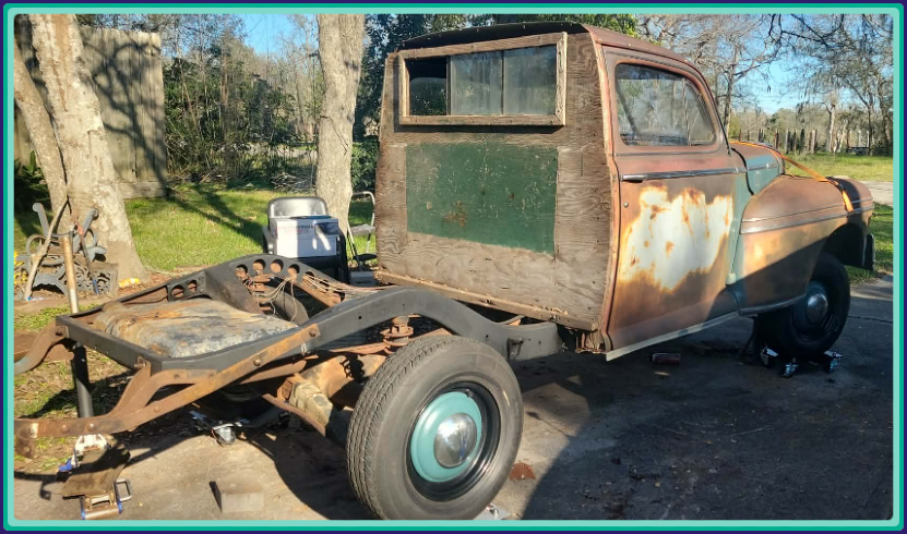 This also brings us to decision time. Which path do we take from here. We know the current "cut-off" pickup version simply ain't gonna cut it(pun intended). Not a chance. So a "rebody" is mandatory. This is the tricky part. Do we stray from originality and go with the tried and true Woodie Wagon version, thereby making us "one of the Fab Five Six" as it were. Come to think of it, in actuality that makes us "one of three" due to the fact there's only two other 1948 Mercury Marmon-Herrington AWD Conversion's known to exist.