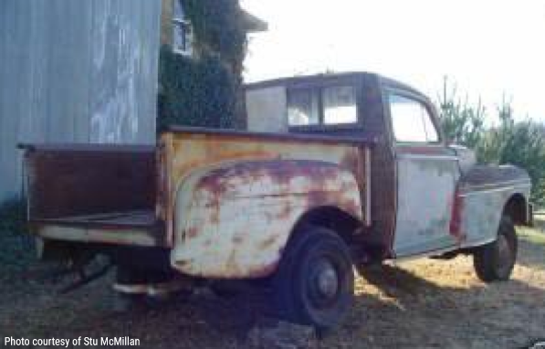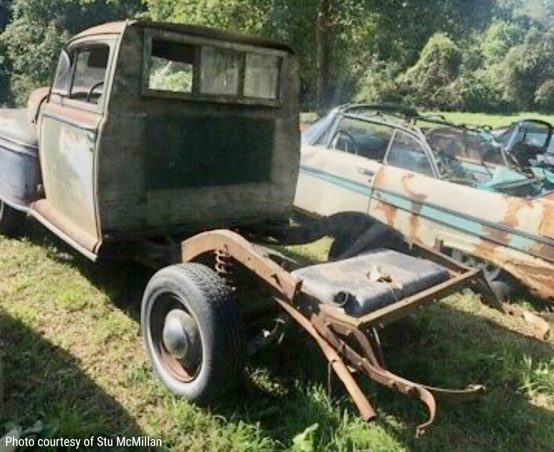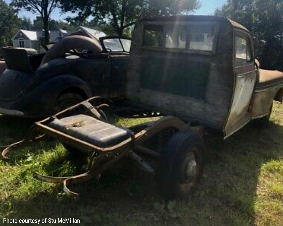 Next "sighting" was approx. 10 years ago. As you can see in photos four, five, and six the pickup "bed" had been removed and the repair to the rear of the frame had been initiated. Why was the rear section of the body removed and the Sedan converted into a pickup? We aren't exactly sure.