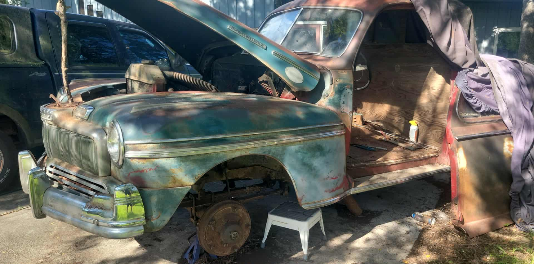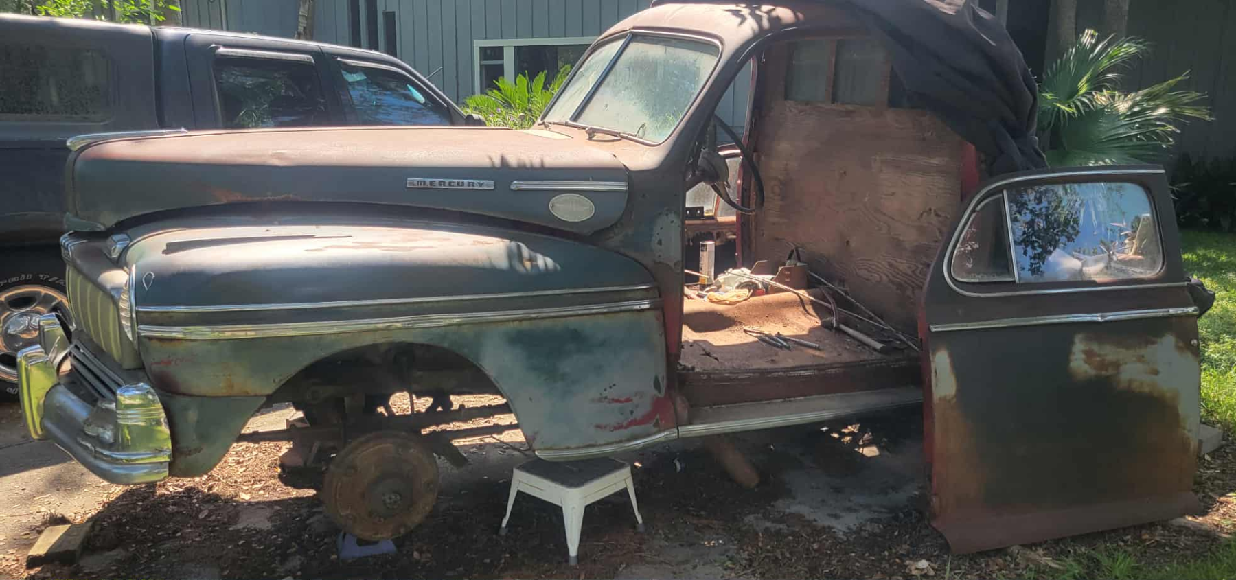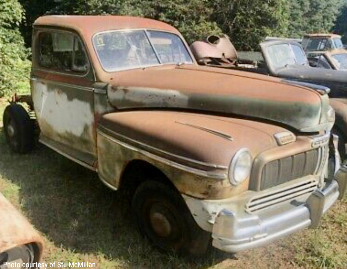 As the story goes the Mercury was at that time owned by two brothers in Kansas. The two photos with the pickup bed installed demonstrate the condition it was in at the time of the listing. The third photo in the gallery shows the Ebay listing at that time. It was advertised as being a "Woodie" Station Wagon that had been rebodied into a Sedan.